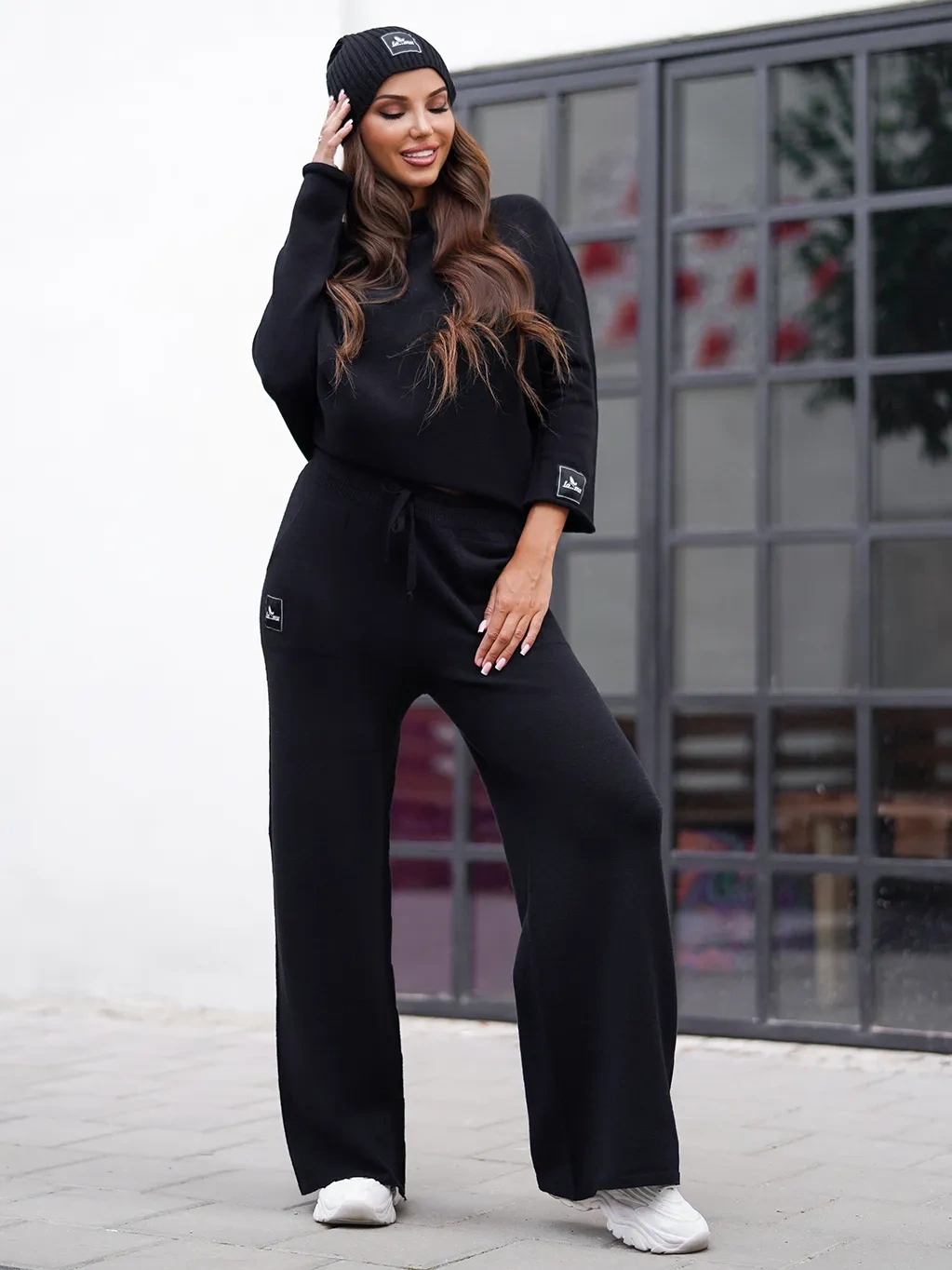 • Sweterkowy luźny komplet, składający się z długich spodni z elastycznym pasem i szerokimi nogawkami, oversizowej bluzy oraz klasycznej czapki.