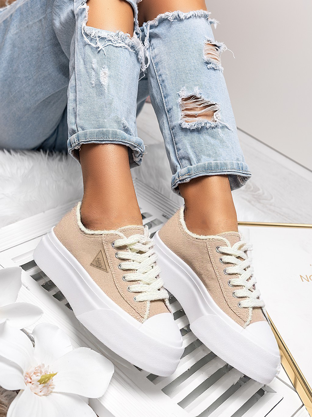 • Damskie trampki na wyższej platformie. Posiadają cholewkę z tkaniny, gumową podeszwę oraz grubsze sznurówki. Buty pasują do codziennych, miejskich stylizacji.