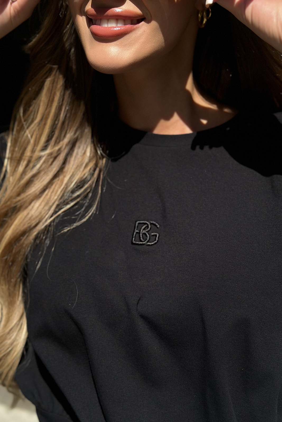 Ta sukienka łączy swobodny charakter z dopracowaną formą. Góra w stylu luźnego T-shirtu zapewnia komfort i lekki, miejski look, a dół dopasowuje się do sylwetki, podkreślając kobiece kształty. Regulacja sznurkiem po boku pozwala tworzyć efektowne marszczenie i odsłonięte kółko w talii. Na środku znajduje się trójwymiarowe logo BG, które nadaje całości wyrazistego stylu.