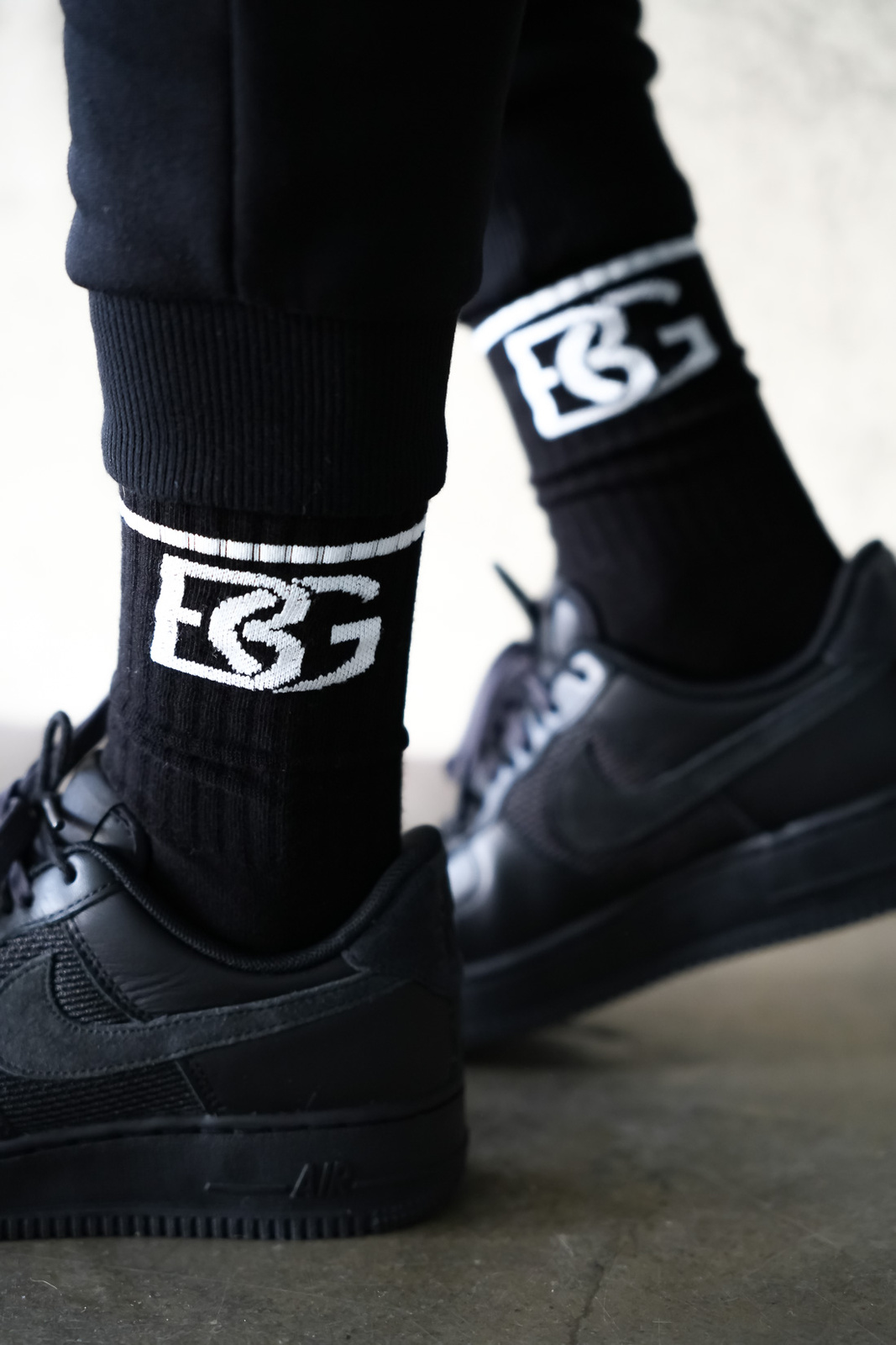 Bawełniane, czarne skarpetki z białym logo marki BG. Świetnie sprawdzą się do sportowych stylizacji. Idealne dopełnienie do Naszych dresów!