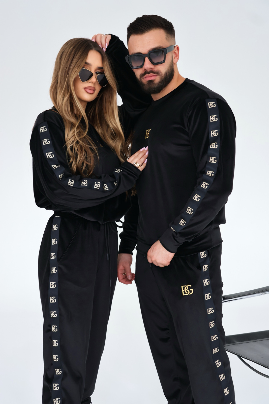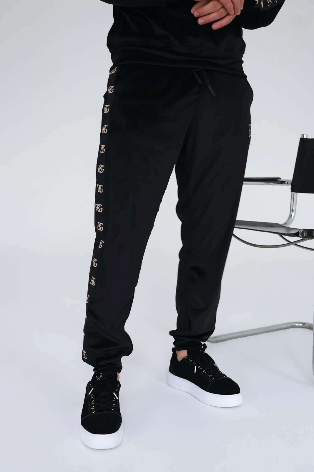 Opis produktu: Dres welurowy BG LORDY. Bluza oraz spodnie zdobione haftowanym logo BG w kolorze złotym. Na rękawach oraz nogawkach spodni ozdobne czarne lampasy ze złotym logo BG. Spodnie posiadają gumkę w pasie oraz sznurek.