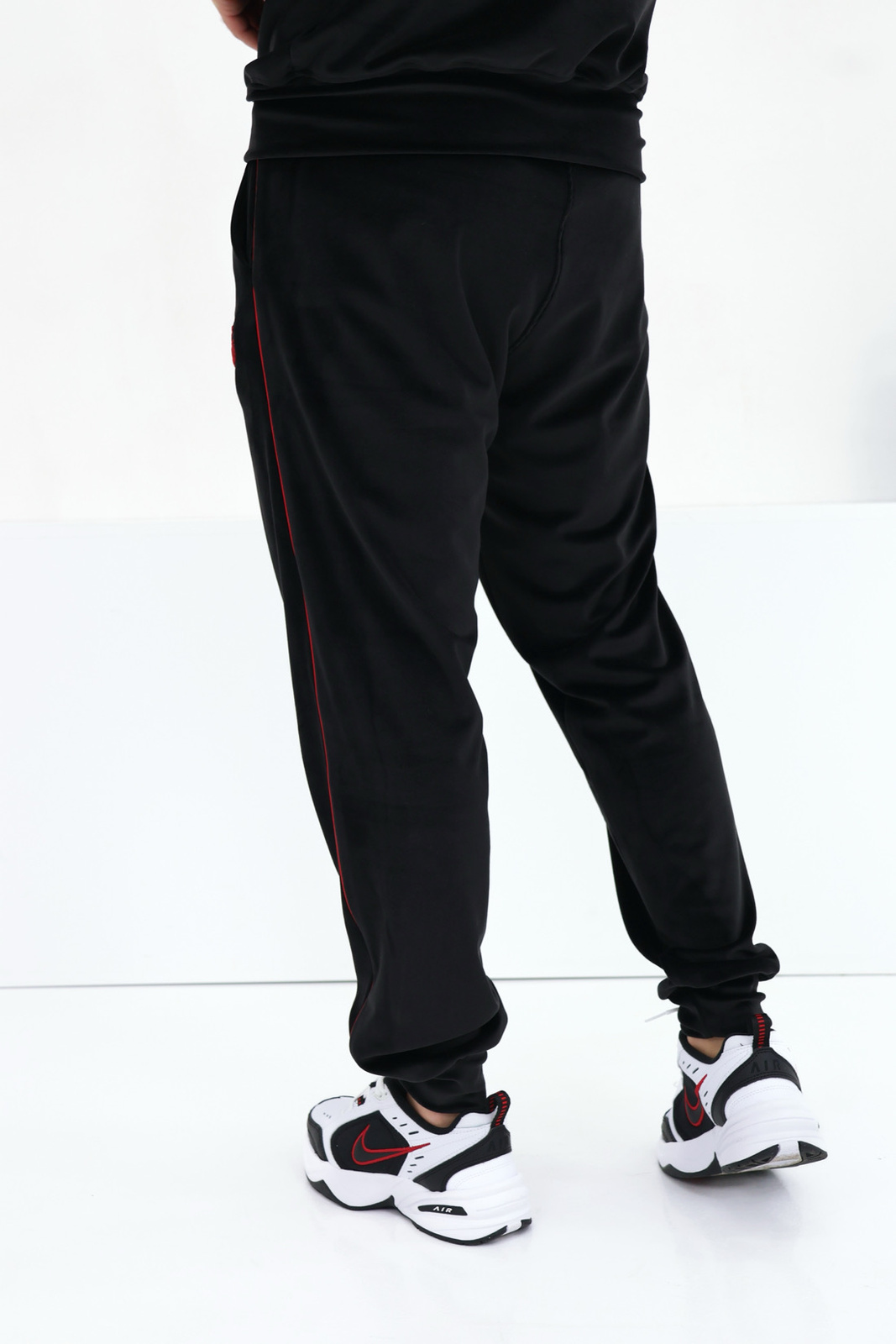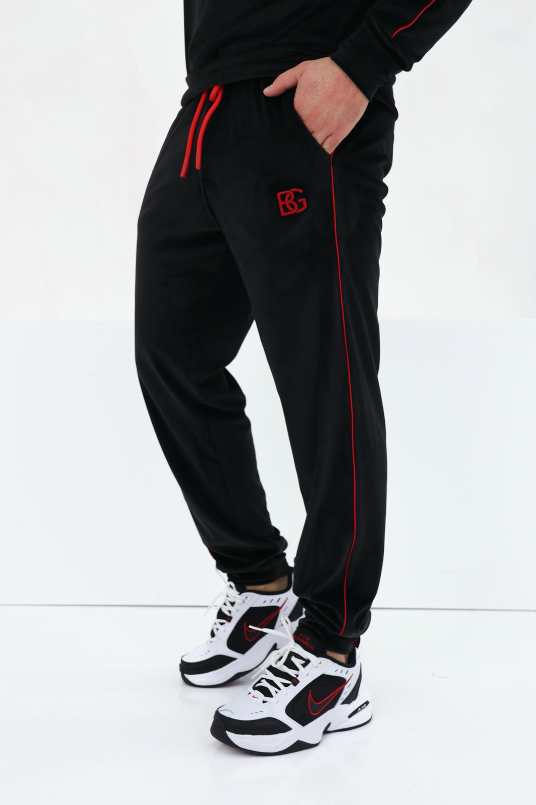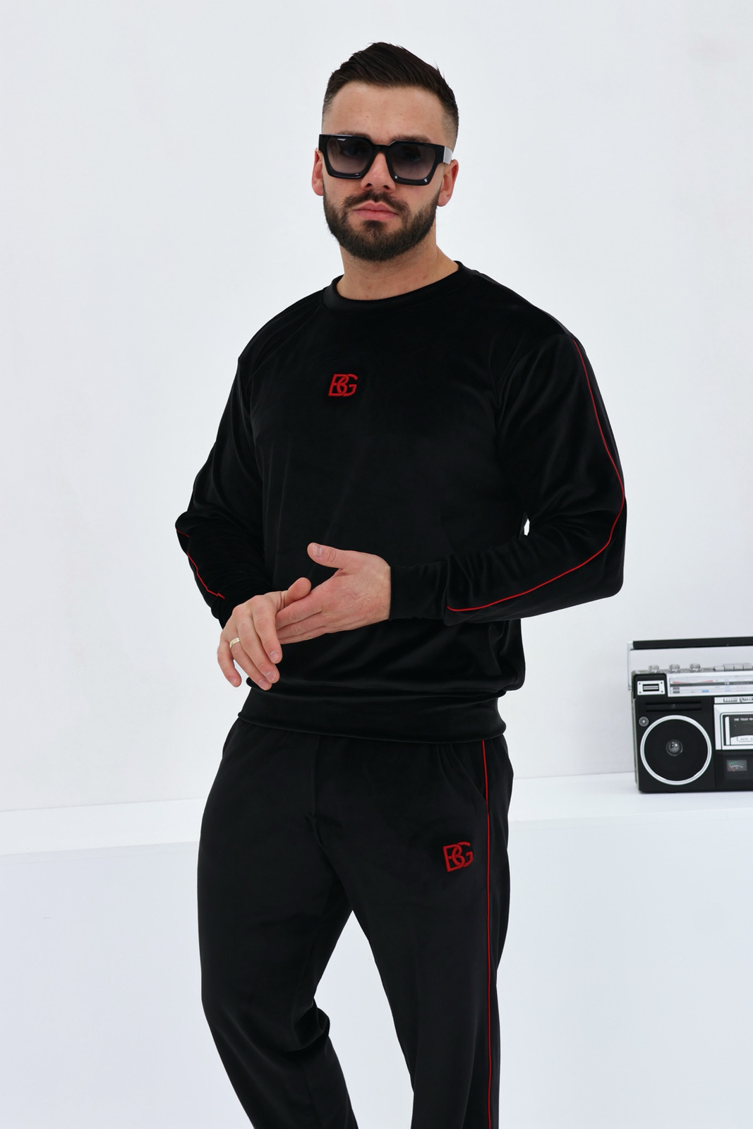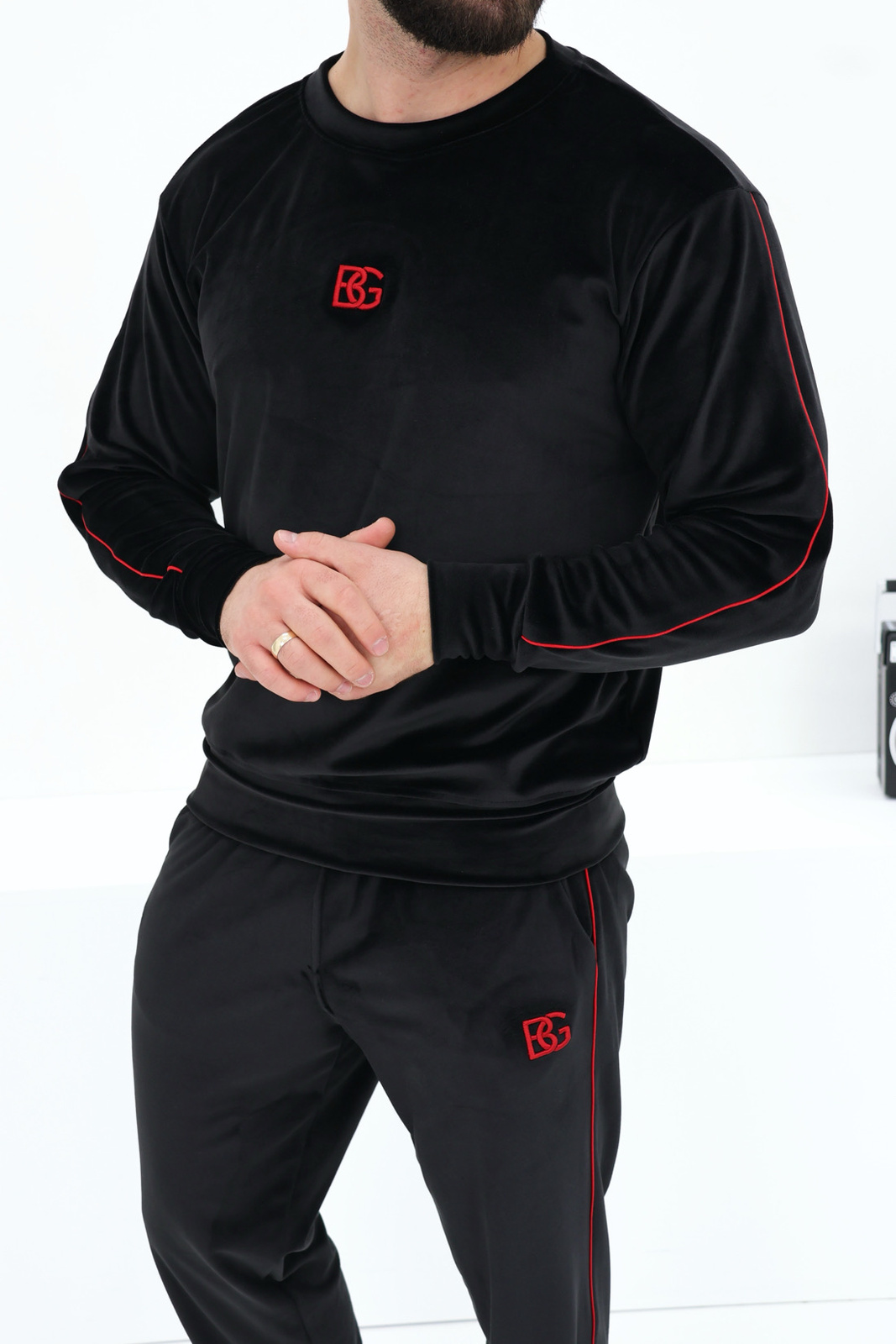 Opis produktu: Dres welurowy BG AERO. Bluza oraz spodnie zdobione haftowanym logo BG w kolorze czerwonym. Dodatkowo zewnętrzne szwy rękawów oraz nogawek spodni zdobione czerwoną wypustką. Spodnie posiadają gumkę w pasie oraz sznurek.