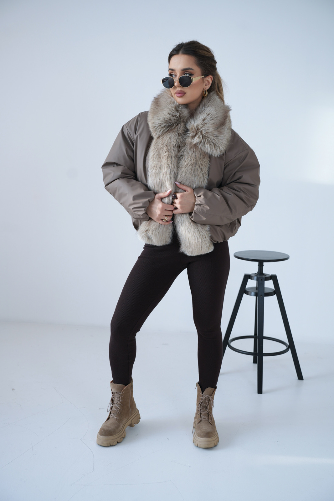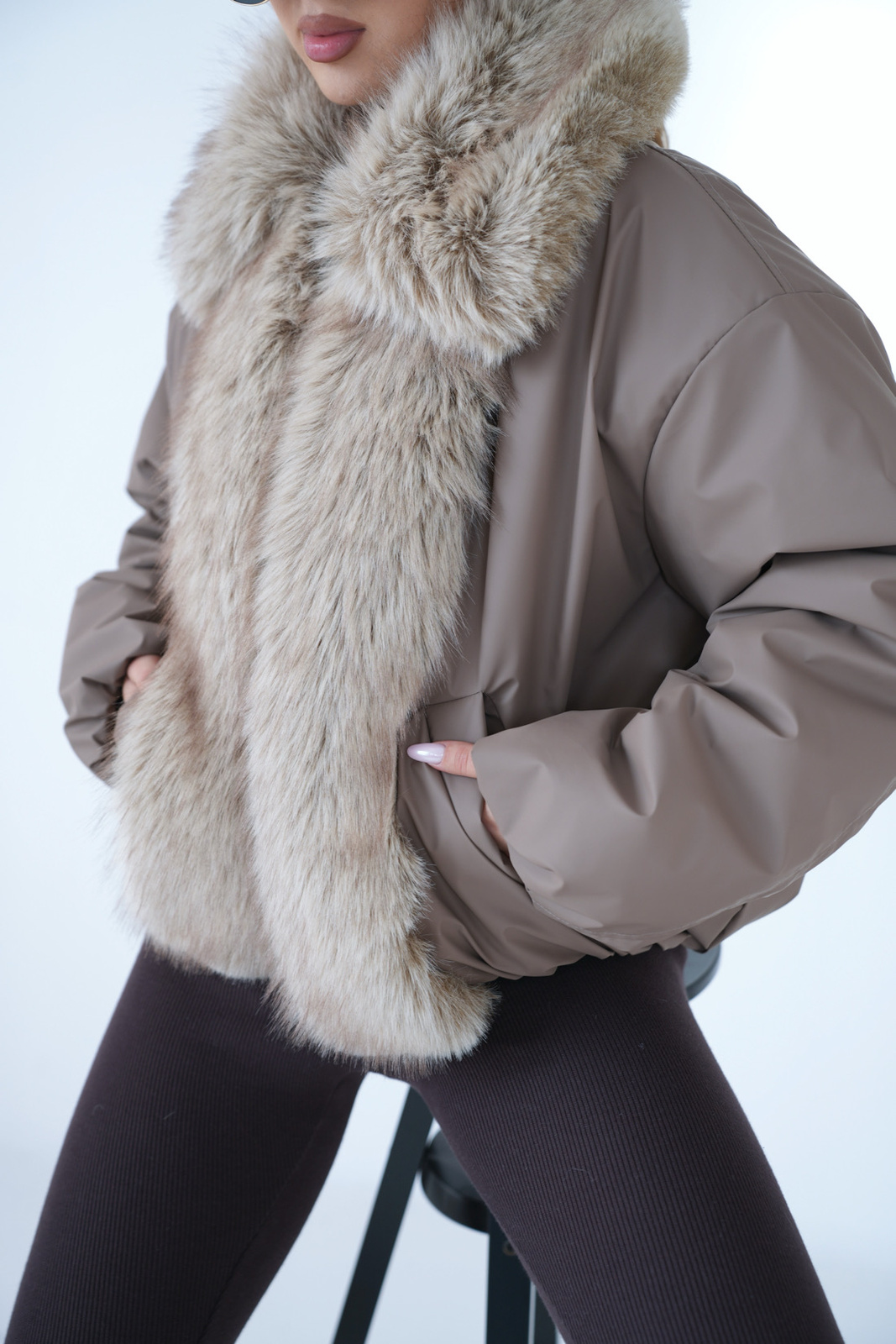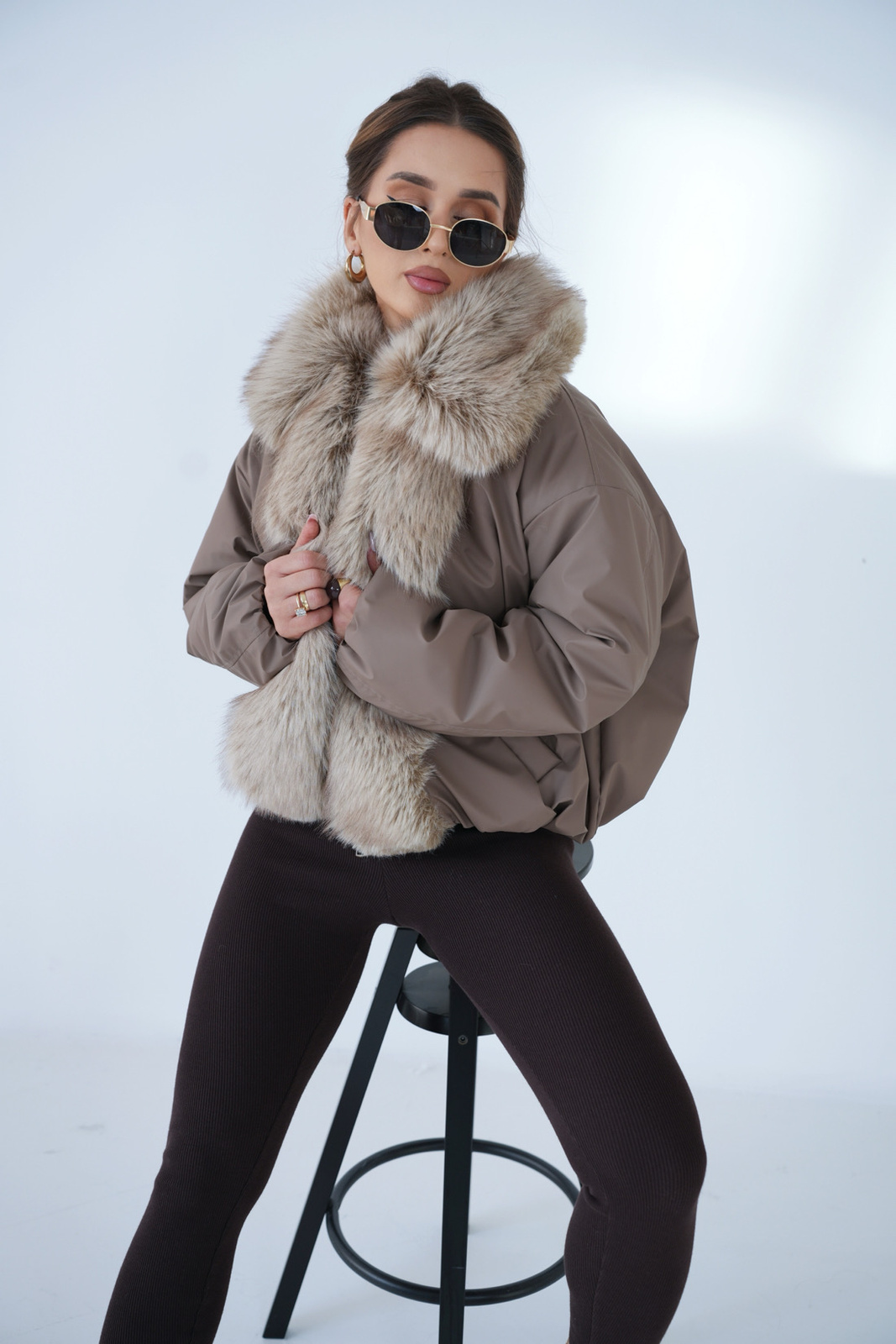 Opis produktu: Krótka, oversizowa kurtka bomberka o mocno streetwearowym, zadziornym charakterze. Matowa tkanina zewnętrzna z delikatnym połyskiem – w 100% wodoodporna, lekko szeleszcząca, idealnie chroni przed deszczem i wiatrem. Ogromny, puszysty kołnierz i szerokie klapy wykonane z ultra-gęstego, mięciutkiego sztucznego futra. W środku gruby, miękki ocieplacz, który sprawia, że kurtka jest niesamowicie ciepła nawet w największe mrozy. Luźny, lekko pudełkowy krój, opadające ramiona, szerokie rękawy i zamek błyskawiczny po całości. Krótka długość kończy się tuż nad biodrami, dzięki czemu świetnie wygląda zarówno do legginsów i wysokich butów, jak i do spódnic czy sukienek. To nie jest zwykła zimowa kurtka – to prawdziwy statement piece: odważny, ciepły, nieprzemakalny i nieprzyzwoicie stylowy.