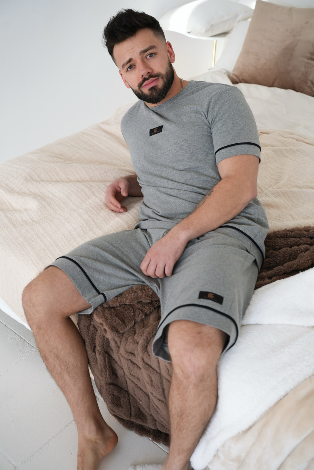 Opis produktu: Męska piżama dwuczęściowa z wysokiej jakości bawełny z elastanem. T-shirt z krótkim rękawem. Luźne szorty do kolan. Wykończenie: czarne lamówki i małe metki z logo marki BG Brandenburg Couture. Prosty, męski klasyk do spania.