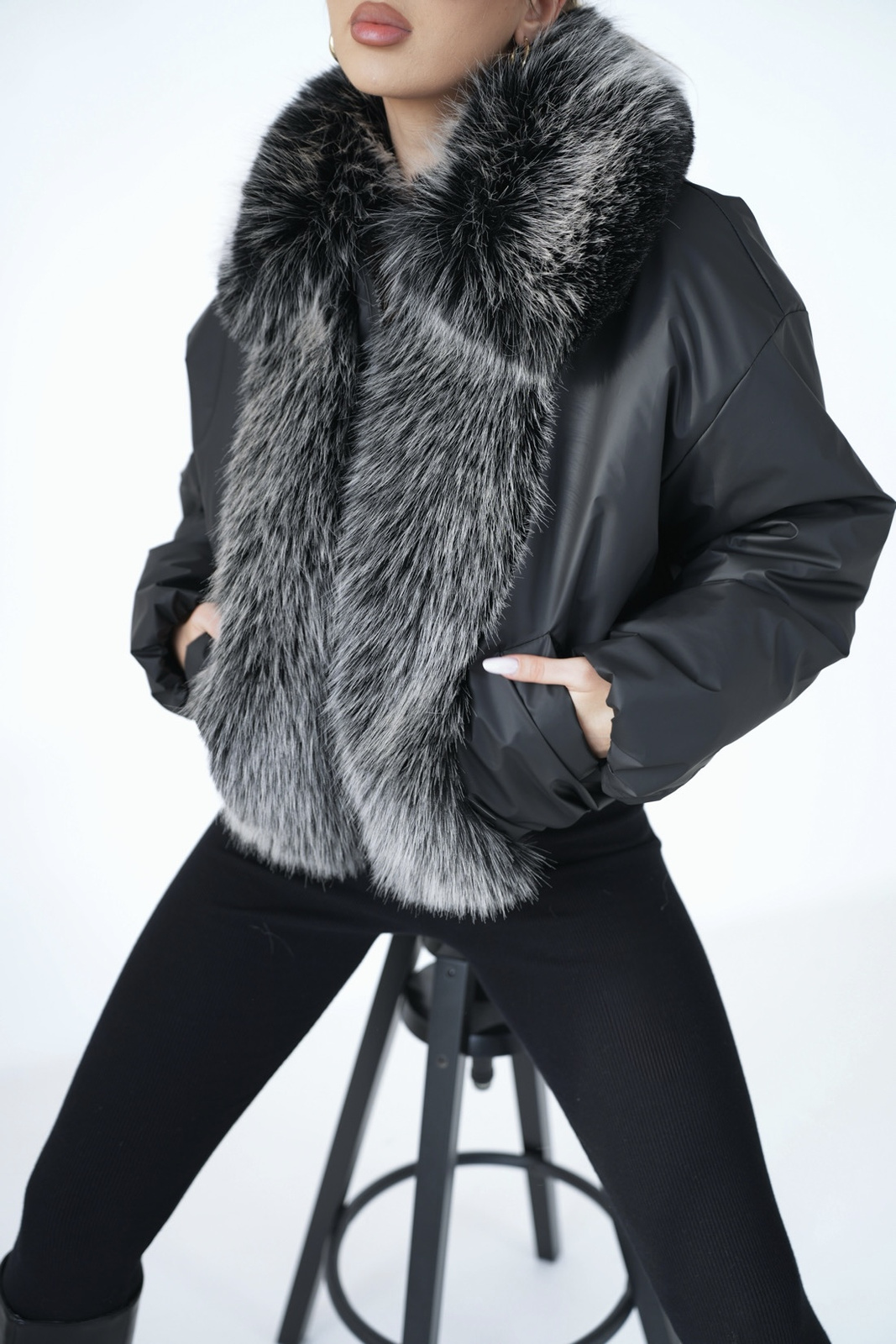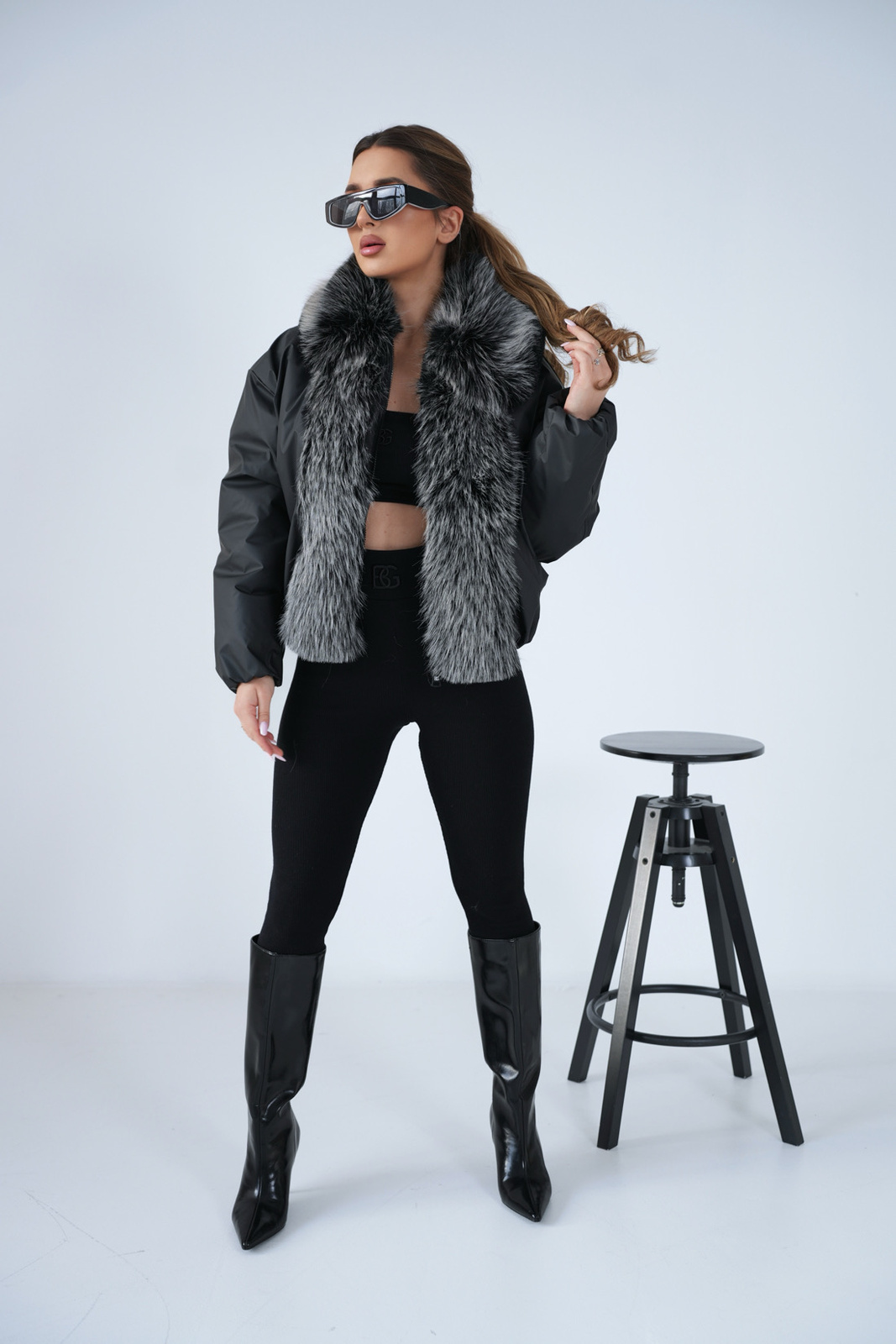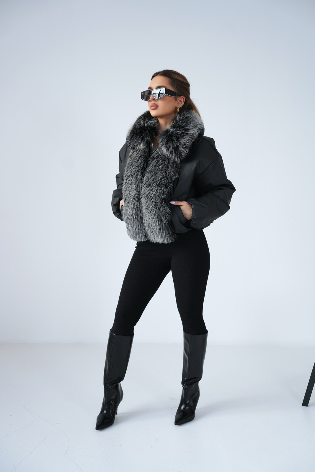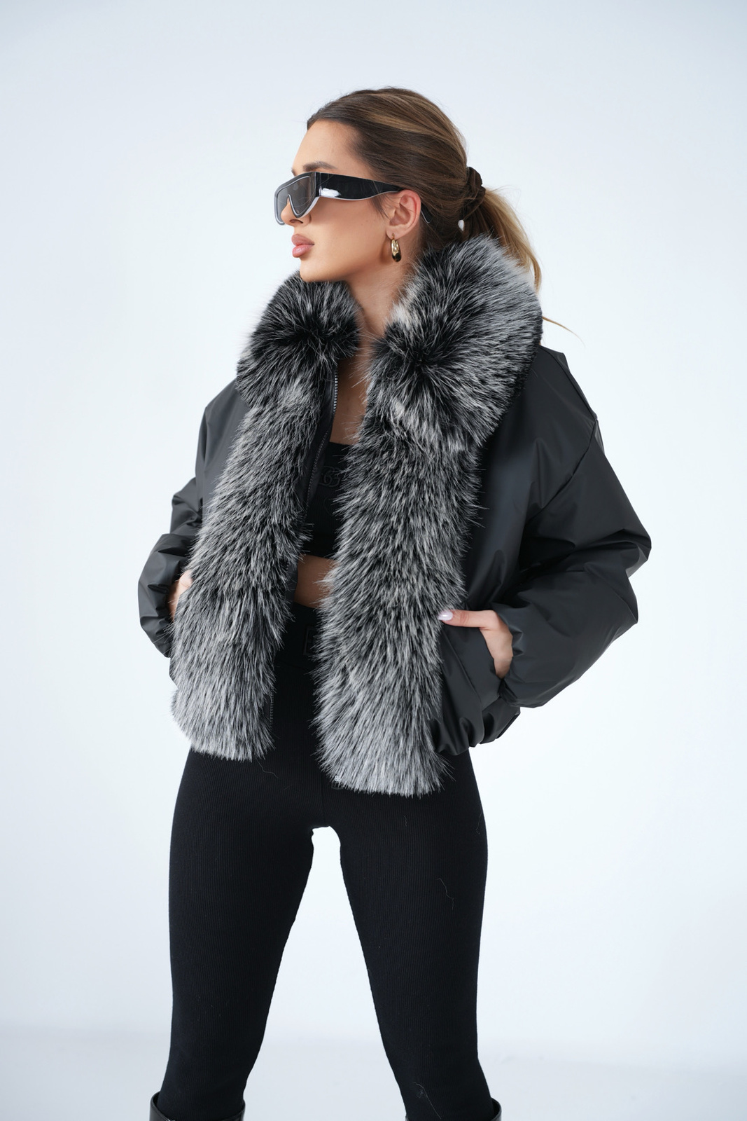 Opis produktu: Krótka, oversizowa kurtka bomberka o mocno streetwearowym, zadziornym charakterze. Matowa tkanina zewnętrzna z delikatnym połyskiem – w 100% wodoodporna, lekko szeleszcząca, idealnie chroni przed deszczem i wiatrem. Ogromny, puszysty kołnierz i szerokie klapy wykonane z ultra-gęstego, mięciutkiego sztucznego futra. W środku gruby, miękki ocieplacz, który sprawia, że kurtka jest niesamowicie ciepła nawet w największe mrozy. Luźny, lekko pudełkowy krój, opadające ramiona, szerokie rękawy i zamek błyskawiczny po całości. Krótka długość kończy się tuż nad biodrami, dzięki czemu świetnie wygląda zarówno do legginsów i wysokich butów, jak i do spódnic czy sukienek. To nie jest zwykła zimowa kurtka – to prawdziwy statement piece: odważny, ciepły, nieprzemakalny i nieprzyzwoicie stylowy.