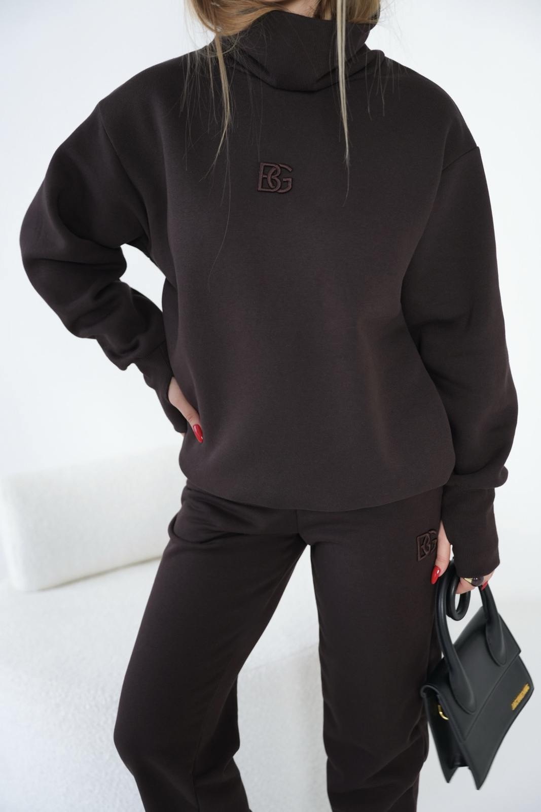 Opis produktu: Oversizowa bluza damska. Gruba, ocieplana od środka dzianina dresowa – mięciutka, ciepła, z delikatnym meszkiem wewnątrz. Na przodzie klasyczne haftowane logo marki BG Brandenburg Couture w tonacji materiału. Dodatkowo dyskretne kieszenie w szwach bocznych, szerokie ściągacze przy rękawach z otworem na palec. Wokół szyi wysoki golf ze ściągacza z możliwością wywinięcia.