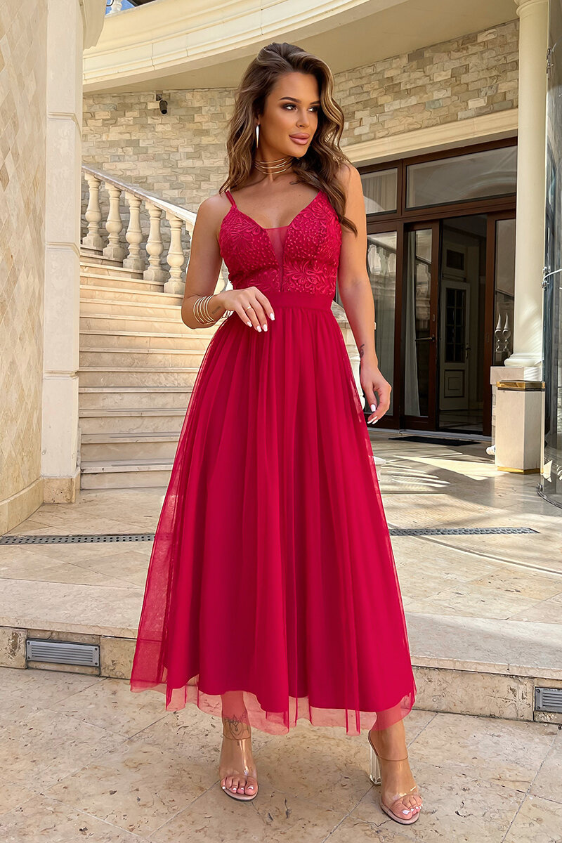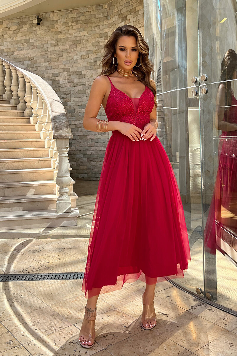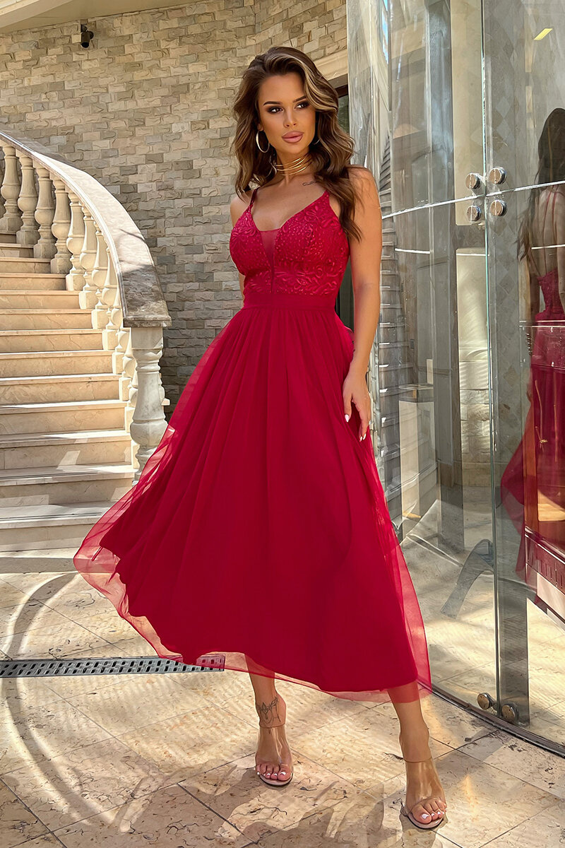 Niezwykle dziewczęcy model sukienki uszyty ze ślicznej koronki. Sukienka na cieniutkich ramiączkach, z dekoltem w serek, wykończonym minimalistyczną siateczką. Dół warstwowy, rozkloszowany, przepasany paseczkiem z kokardką ze spódnicą o długości 7/8. Model dostępny w pięknej gamie kolorystycznej.