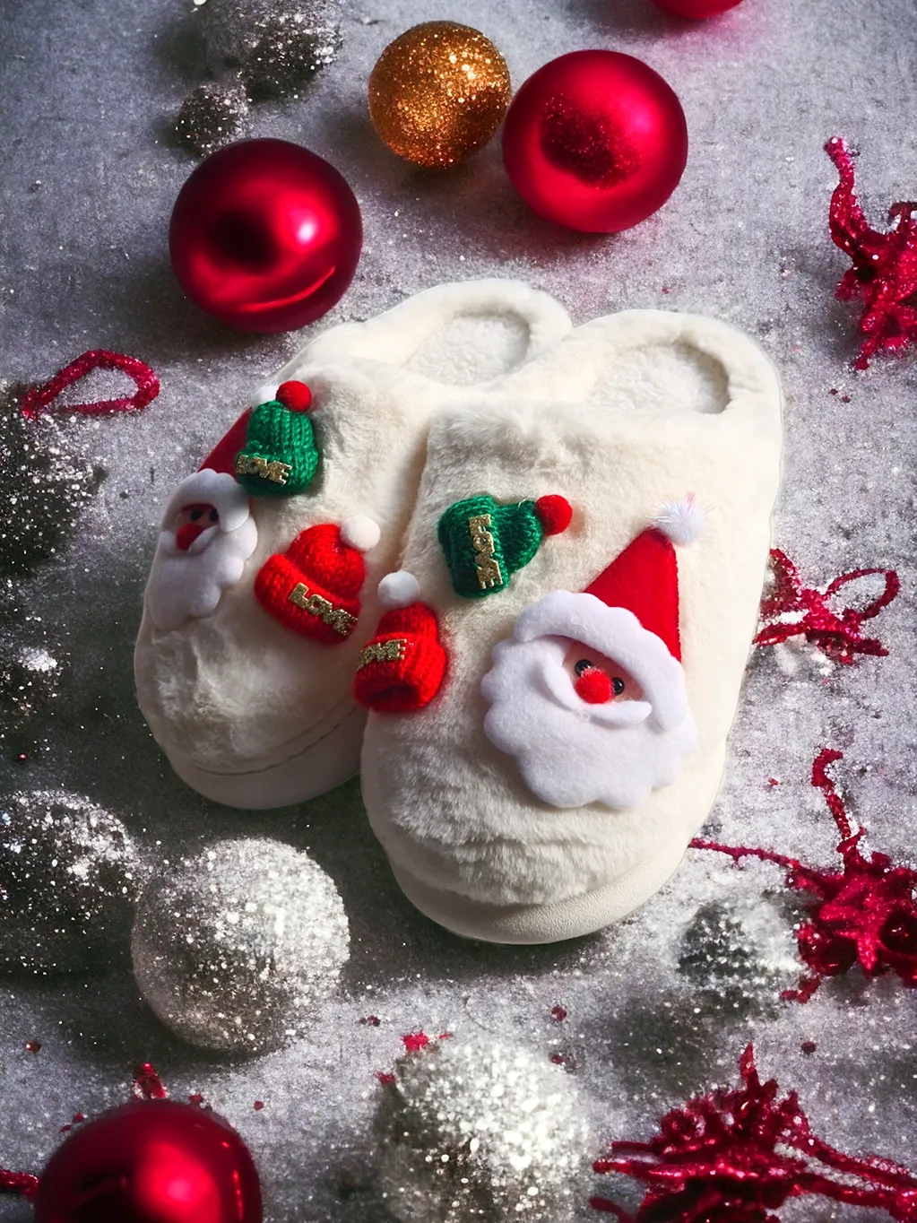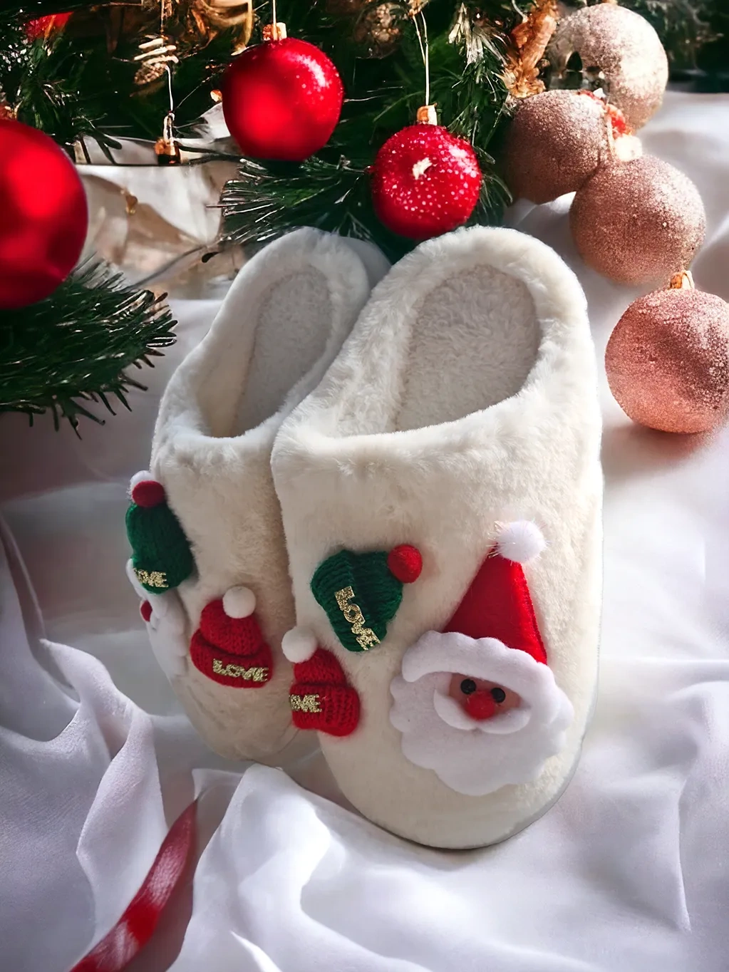 • Klasyczne, damskie kapcie ze motywem Świętego Mikołaja, pokryte miękkim futerkiem. Świetnie będą wyglądały do wielu jesiennych i zimowych stylizacji.