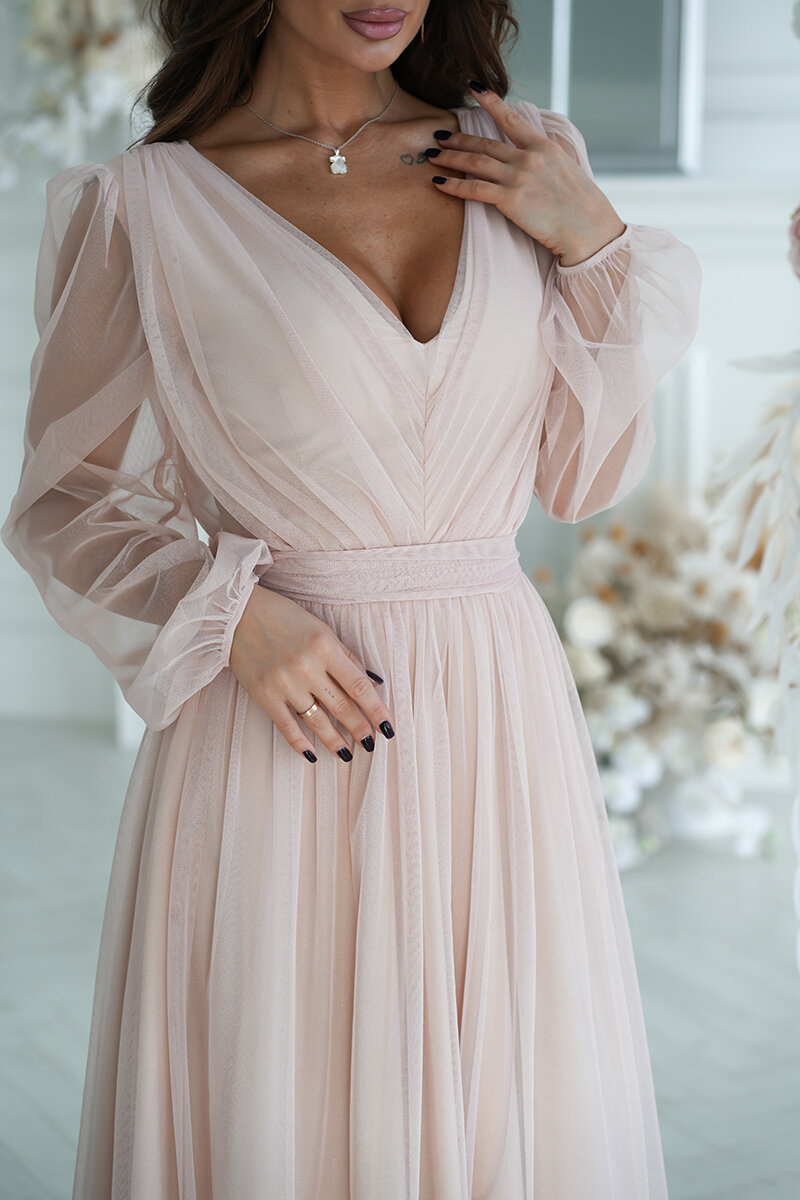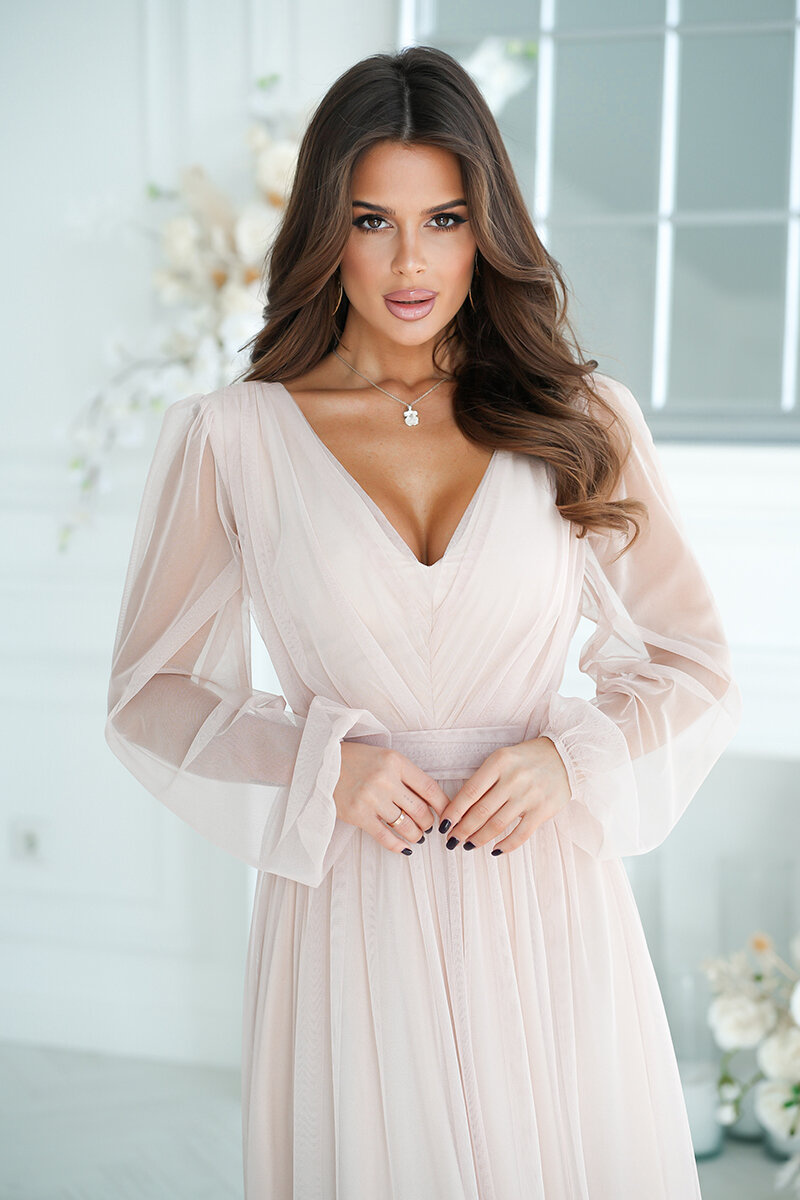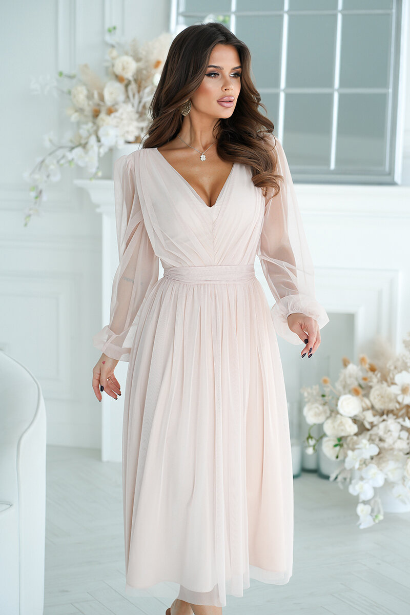Sukienka midi z  lekko rozkloszowaną warstwową spódnicą wykończoną brokatową siateczką. Góra kreacji marszczona z długimi rękawami zakończonymi gumką. Rękawki uszyte z takiej samej  siatki co reszta sukienki. Dekolt i plecy w kształcie serka. Model dodający szyku i kobiecości. Dostępny w przeróżnych kolorach. Skład:  100% Poliester (podszewka), 70%Wiskoza, 30% Poliester Kod produktu: 269-08 Kolor: błękit Zamek: kryty z tyłu Wymiary modelki: 88-60-90 Rozmiar na modelce: 34 Model występuję w rozmiarach 34, 36, 38, 40, 42, 44, 46