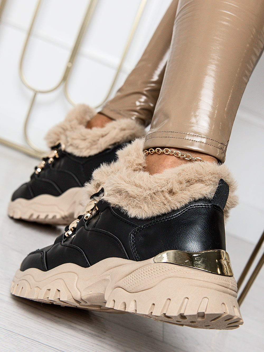 Damskie ocieplane buty sportowe czarne z beżową podeszwą i złotą zapiętką
