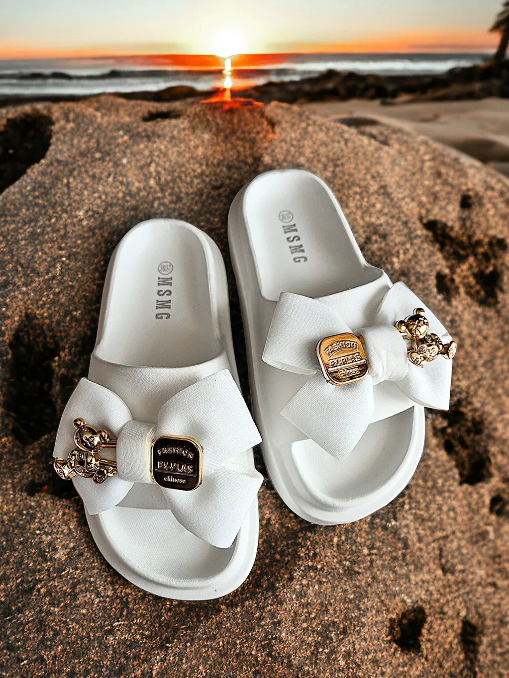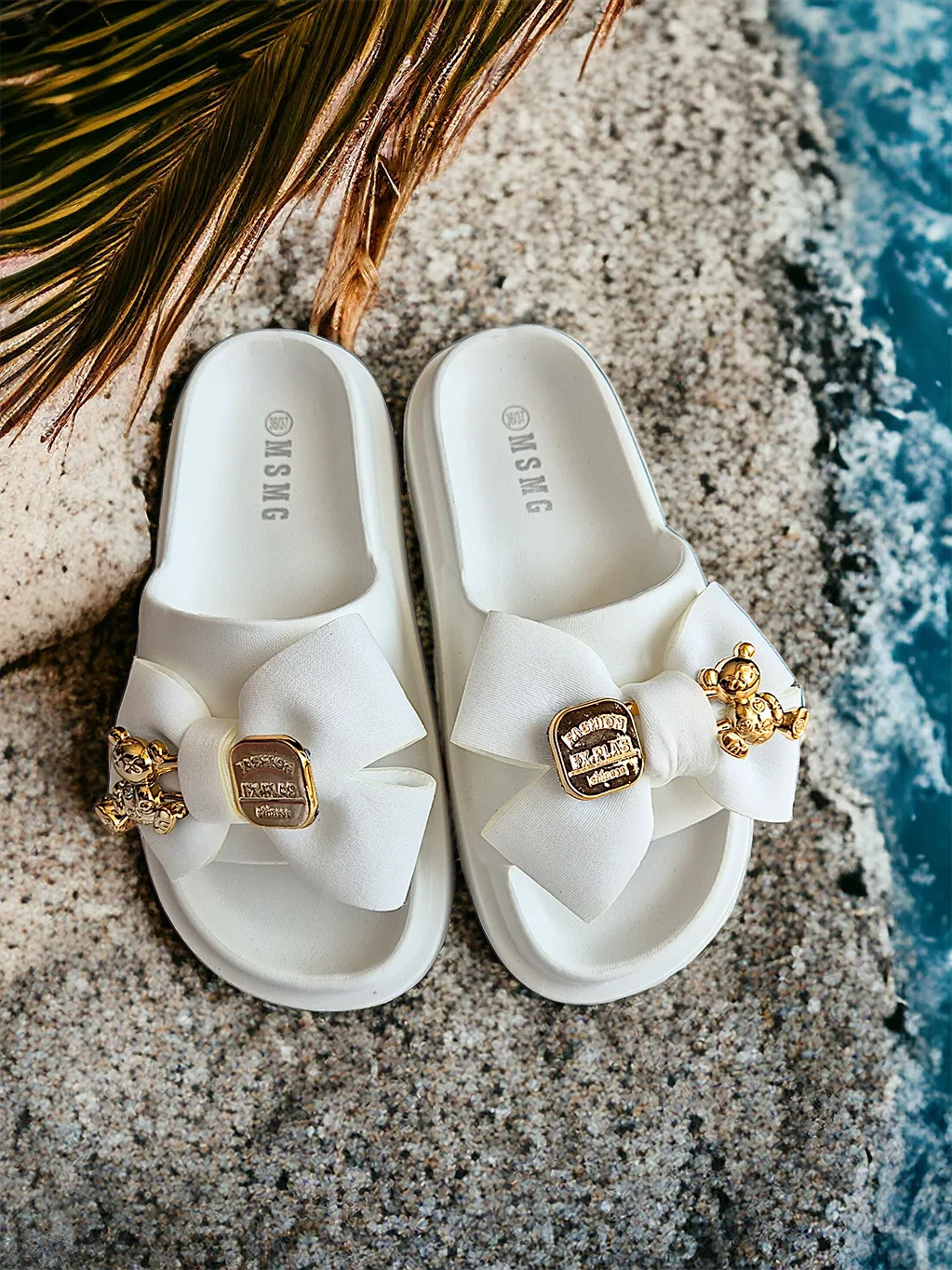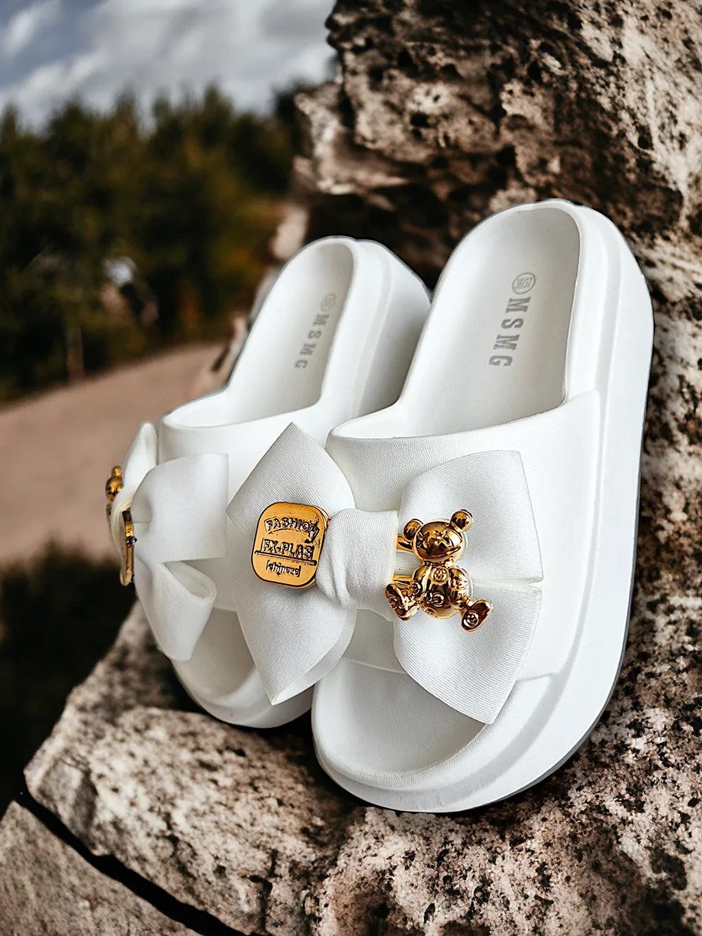 • Damskie lekkie i stylowe klapki, posiadają grube, płaskie podeszwy, które zapewniają komfort podczas chodzenia. Ozdobione są dużą kokardą, do której doczepiono złotą aplikację z misiem.